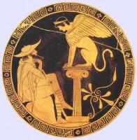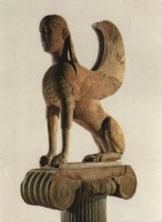 A minósi-mykénéi művészetben kedvelt díszítőmotívum volt a macskatesttel, szárnnyal, női fejjel ábrázolt keveréklény. Ez a képtípus a Kr. e. 8. sz. második felében tűnik fel újra a görög művészetben, ám nem tudjuk, mikor azonositották a thébai sphinx-szel. Kezdetben az ábrázolásokon a sphinx férfi is lehetett, szakállal és sapkával. A Kr. e. 5. századtól női formában jelenik meg. Az archaikus korban az ión oszlop tetején ülve ábrázolt sphinx kedvelt fogadalmi ajándék volt. Attikában sírsztéléket is díszítettek vele. Itt a halál szimbólumaként és a sír őrzőjeként jelent meg. Híres az az ábrázolás, amely csak Pausanias leírásában maradt ránk, de valaha az olympiai Zeus-templom kultuszszobrának trónusát díszítette: elülső lábain thébai ifjak hevernek, akiket sphinxek ragadnak meg (Görögország leírása, 5,11,2). A sphinx gyakran egyszerű dekorációs elem az építészetben, a bútorokon vagy sisakdíszeken. A sphinx története az ókor után is folytatódott. A barokk művészetben például gyakran tűnik fel kastélyokban és kertekben, a 19. században pedig a végzetesen vonzó nő (femme fatale) szimbóluma lett. Felhasznált irodalom: B. Bäbler - S. Seidlmayer, Der Neue Pauly, Enzyklopädie der Antike XI (2001), 816–819, s.v. sphinx Kerényi Károly, Görög mitológia, Budapest 1977, 41–42, 248–250. Birkás Éva 2013 |