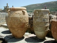 | | Pithosok Krétáról | Agyagból kézzel formált, nagyméretű, gyakran embernagyságú, vastagfalú, öblös tárlóedény, amelyet a ház raktározásra alkalmas részében, félig földbe ásva tartottak. Általában bor, olaj, gabonafélék tárolására használták a bronzkortól egészen a római korig. |