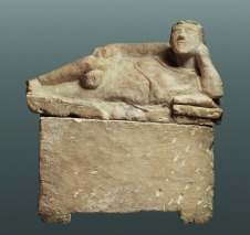 Alabástromból faragott, díszítetlen, négy alacsony, szabálytalan lábon álló, trapéz alakú urna. A hasonló alakú fedélen a baloldalán fekvő, fejét baljával feltámasztó nőalak látható, kissé behajlított jobb karja a jobb térdén nyugszik (kezében egykor talán gránátalmát tartott). Az asszony elnagyolt kidolgozású térdig érő, redőzött ruhát visel, középen elválasztott haját a tarkón kontyban fogták össze.