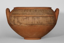 Alacsony talpon álló, öblös testű (talán borvegyítő) edény. Mindkét oldalát a függőlegesen álló fülek között geometrikus motívumok díszítik: pettyezett körök sora, labyrinthos-, ezalatt pedig hullámvonalakkal kitöltött bástya-minta. A festés sárgásvörös és rózsaszínes.