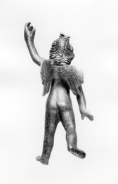 Állapot:A bal kezében tartott tárgy hiányzik, ettől eltekintve ép. A bal talpon modern furat. A bronz felületét sötétbarna, a hason kissé világosabb patina borítja.