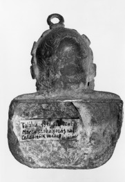 Állapot:Felületét szemcsés, zöld patina fedi. Hátsó oldalán két, a korrózió által okozott lyuk található