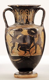 Amphora, echinus alakú szájjal, korong alakú festetlen talpon, hármas osztású fülekkel. Nyakán körbefutó palmettadísz. Mindkét oldalán Héraklést ábrázoló jelenetek: az egyiken az amazónokkal harcol, a másikon a delphoi tripust igyekszik elrabolni Apollóntól, aki megakadályozza ebben. Kétoldalt Athéné és Artemis figyeli őket. A 19. század elején készült hamisítvány, valahol Dél-Itáliában, feltehetően Nápolyban, egészen biztosan 1842 előtt. Ebben az évben készült el ugyanis Fejérváry Gábor gyűjteményének katalógusa, és ez a darab már szerepel benne. A Kr.e. 490-430 közti időszakból származó amphora eredetileg festetlen volt. A tripusrablást ábrázoló kép egy ókori, jelenleg Bécsben őrzött festett váza alapján készült, a másik jelenet forrása ismeretlen. A kompozíciókat rárajzolták az eredetileg egységesen fekete felületre, majd az alakok körül levésték a hátteret és vöröses színű gipsszel töltötték ki. |