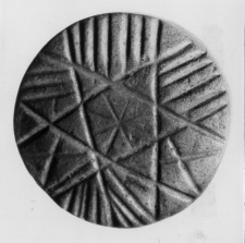 Vörös, narancs és fehér réteges jáspisból készült vésett, vonalas díszítésű korong alakú pecsétlő kő. A három párhuzamos vonalpár keresztezéséből létrejött hatszögű csillag közepén létrjött hatszögben vésett csillag minta látható. A pecsétlő szélén, a csillag csúcsai közötti helyet vésett párhuzamos vonalcsoportok vagy keresztmotívumok töltik ki.