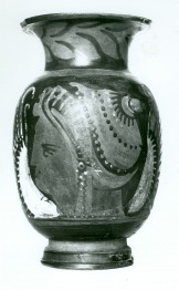 Lépcsős talpú, ovális testű oinochoé kettős rúdfüllel, amely kétfelé hajolva csatlakozik a szájperemhez. A vállon és a lábon kihagyott, festetlen sáv. A nyakon babérág. A fül alatt palmetta, két oldalán félkörív, hármas levelek és spirális indák. A testen elöl balra néző női fej hajhálóval (sakkos), két oldalán szárnyak. Sárga járulékos színnel a hajháló mintái, az ékszerek, a pontok a szárnyakon. Fehérrel a szárnyak belseje, a tollak alja és vége a pontsor két oldalán. A profilban ábrázolt női fej a késői apuliai műhelyek egyik kedvenc motívuma. A váza a Kr.e. 4. század utolsó két évtizedében készült, valószínűleg Canosában működő Kantharos-festőnek a műve. attribúció |