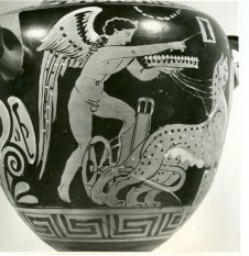 A képmezőben kettős párducfogaton jobbra vágtató, ruhátlan, szárnyas Erós. Bal kezében gyeplő és egy nagy tál süteményekkel, jobbjában ostor (kentron). A párducok alatt talán oltár. Fölül koszorú, ablak, füzér. Sárga járulékos színnel a koszorú, füzér, sütemények, részletek a szárnyon. Fehérrel az ostor, gyeplő és részletek a szárnyon.