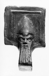 Zsarátnoktartó edény fülének közepesen finom, élénk téglavörös nílusi agyagból készült öntőmintája. Az eredeti modell maga is meglehetősen kopottas lehetett: szatírmaszkot ábrázolt elölnézetből, hosszú süveggel, felvont szemöldökkel és tágra nyitott szemmel. Az orr széles és rövid, az ajkak vastagok, a hullámos szakállat hosszú, párhuzamos fürtökbe rendezték. A pyraunosokban (kerámia zsarátnoktartókban) szenet égettek melegítés vagy főzés céljából, és gyakran látták el őket domborműves megmunkálású, szatírfejet mintázó fogókkal, amelyek az edény belseje felé néztek. Ennek a díszítésnek gyakorlati rendeltetése is volt: az előreugró szakállak tulajdonképpen a melegítendő edény tartóiként szolgáltak. Szatírfejes fogójú edényeket találtak még Egyiptom mellett a Földközi-tenger keleti partvidékén, a görög szárazföldön és Dél-Itáliában is: feltehetően ezek többsége közös görög előkép helyi utánzata lehet. Az egyiptomi helyi készítést támasztja alá, hogy ebben az esetben maga az öntőminta került ott elő. A 2. kép a mintából készített modern öntvényt ábrázolja.