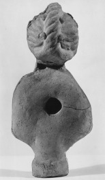 Hellénizáló vonásokat mutató nőalak. Haja gerezdes fürtökből áll, a fejtetőre egy hajfonat van tűzve, a mellette látható négy kis gömb valószínűleg a hajtűket jelöli. Bal melle előtt egy közelebbről nem meghatározható tárgyat tart. A ruha a jobb mellnél kalapost alkot. Valószínűleg késő- hellénisztikus szicíliai előképek nyomán készült. Világos téglaszínű agyagból, két erősen elhasználódott félformából készült. Belül üreges, hátán kerek lyuk található. A formából való kivétel után az alak két felét gondatlanul illesztették össze.