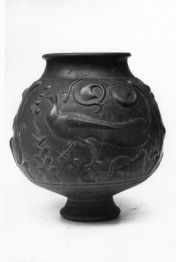 Agyaga sárgásvörös. Felületét barnásvörös bevonat borítja. Hosszúkás, konkáv, csonkakúpra emlékeztető talpgyűrűjén gömbölyded test ül. Nyakrésze alacsony, ívelten kihajló, hozzá alacsony, kifelé duzzadó perem csatlakozik. A perem az égetés során deformálódott. A hason vízszintes vonalak között cseppentett (à la barbotine) technikával felvitt díszítés: borostyánindák között bogyót csipegető páva látható. A váza a H. Dragendorff által kidolgozott tipológiai felosztásban az 54. típusba tartozik (Drag. 54-es forma). |