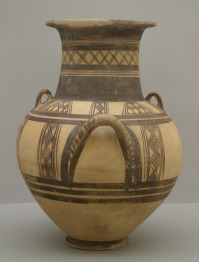 Barnássárgára égetett, sötétbarna geometrikus festéssel díszített hydria. Öblös testű, magas ívelt nyakú, kiszélesedő szájperemmel. A hason és a vállon két-két íves, fölfelé álló fül. A nyakon vízszintes sávok között csúcsukra állított, kettős vonallal megrajzolt négyzetek; a vállon rácsozott rombuszokkal kitöltött háromszögek és függőlegesen rácsozott rombusz-sorok váltakoznak üresen hagyott részekkel. A hason, a két fül között a sávok között hármas motívum: kétoldalt a vállon lévőhöz hasonló rombusz-sor; középen, a vállon lévő fülek alatt pedig az egyik oldalon négyes rombusz-sor, a másikon, ugyancsak függőleges vonalak között, négyágú levél. Az ún. fehér festett áru III. csoportjába tartozik. |