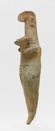 Téglavörös agyagból kézzel formált, üreges testű figura. Kettős kúp alakú testén feje egybemosódik hengeres nyakával. Kiugró orra, nagy kerek szemei és óriási fülei vannak, utóbbiakban egészen biztosan fülbevalókat viselt. Bekarcolások jelzik a hajat, a szemöldököt, a nyakláncot, a kéz- és lábujjakat. Jobb karját átnyújtja a mellei előtt; két kezében talpas edényt tart, benne az áldozati étel. A nemiszerv fölött több sorban vízszintes chevron-minta, körülötte háromszög alakban bekarcolások. Lábai egymáshoz zártak, lábfejét lefeszíti, mintha lábujjhegyen állna. A háta kidolgozatlan. |