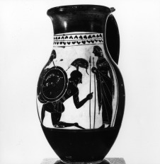 A feketealakos olpét alacsony talpon álló ovoid test jellemzi, amely törés nélkül megy át a széles nyakba. Megvastagodva kihajló szájperem, szalagfül, tövében a szájperemen két oldalt dudor. Az alul kettős vörös vonal határolt képmezőben két pajzsos, páncélos harcos párviadala látható. A jobboldali már lerogyott. Kétoldalt egy-egy ruhás álló alak figyeli a jelenetet, a baloldali szakállas. A képmező fölül borostyánág zárja. Vörös színnel van megfestve a két álló alak haja és szakálla, a sáv a ruhájukban, valamint a győztes harcos lábvérte és mindkettőjük sisakján a sáv. Fehér színnel készültek a sisaktaréjok, a győztes pajzsszíja, továbbá a vesztes harcos pajzsának jelvénye, a két delfin.