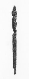 Etruszk bronz íróvessző (stylus) a tetején álló ruhátlan ifjúalakkal. A szára bordázott, vízszintes gyűrűkkel van tagolva. Feltehetően vulcii műhelyben készült.