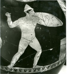 Tojásdad testű, vékony nyakú, kihajló szájperemű hydria. A peremen fekete nyelvminta, ugyanígy a vörösalakos képmező fölött és alatt. Elöl egy sírkő fölött két ruhátlan harcos küzd egymással, lándzsával, pajzzsal, sisakban és lábvértben. A jobb oldali harcos alatt domb. A fegyverek fehér járulékos színnel kiemelve. A viadal rituális voltára utal a sírkő. Campaniai sírok falfestményeiről ismertek hasonló jelenetek, ami alapján feltételezhető, hogy a halott tiszteletére rituális párviadalokat mutattak be. Valószínűleg ezek a későbbi gladiátor-viadalok előzményei. A vázát a capuai Párviadal-festő festette (attribúció) Kr.e. 340-320 körül. |
