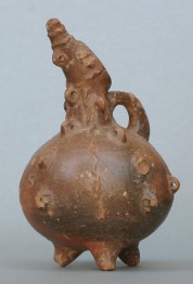 Három lábon álló, gömbölyű testű edény. A nyak csővé szűkülő kiöntőben folytatódik, amelynek felső részén nagyobb nyílás van, nyilván a folyadék betöltésére. Az edény testét és nyakát függőleges sorokban kisméretű, az edény felfüggesztésére szolgáló lyukak díszítik, közöttük agyagból mintázott kígyóvonal fut. Az eredetileg szürkésbarna edényt díszítő vékony máz színe a feketétől a barnáig terjed, díszítése alapján az ún. fényezett vörös áruk csoportjába sorolják. |
