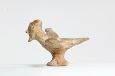 A kézzel mintázott szobrocska kiterjesztett szárnyú madarat ábrázol szakállas férfifejjel. A tömör agyagfigura teste szervesen nő ki a kerek talapzatból. Az orr és a szakáll erősen kiáll az arc síkjából, a további részleteket: a szemet és a csúcsos fejfedőt matt festés jelzi. A darabot feltehetően egykor a halott túlvilági kísérőjeként sírba helyezték.