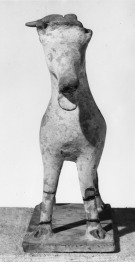 Négyszögletes talpazaton egyenesen álló vadkecskebak. Teste tömör, kézzel mintázott. Az agyag színe sárgásszürke, rajta fehér bevonat, vörös festés nyomaival a szarvon, a nemi szerven és a patákon. A szemek és a szemöldök fekete festékkel volt megjelenítve, ez ma már csak a jobb szemen látszik. |
