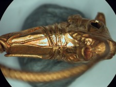 A fülbevaló párját ld. A hellénisztikus kor egyik legnépszerűbb ékszertípusába, az állatfejes karikafülbevalók csoportjába tartozik. Négy fő részből áll: a négy sima drótból összesodort, a vége felé fokozatosan elvékonyodó karikából; a lemezből domborított üreges bikafejből; a karikát és a fejet összekötő, lemezből hajlított és filigrándrótokkal díszített csonkakúpból; az áll alá forrasztott, a karika végét rögzítő tartókarikából. A bikafejen a szőrzetet és a ráncokat poncolással és cizellálással mintázták meg. A szemben eredetileg berakás volt, ma csupán az üreg látható. A tárgy részletes leírását ld. Dági Marianna, SzMKözl 105 /2006/ 225-246, 2. melléklet, 3.sz. A képek számozása: 1) = 3/a. kép 2) = 3/b. kép 3) = 3/c. kép 4) = 3/d. kép 5) = 3/e. kép 6) = 3/f. kép 7) = 3/g. kép 8) = 3/h. kép 9) = 3/i. kép 10) = 3/j. kép 11) = 3/k. kép 12) = 3/l. kép 13) = 3/m. kép 14) = 3/n. kép 15) = 3/o. kép |