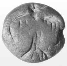 Az ovális alakhoz közeli lencse formájú gemma főoldalán fejét jobbra fordító repülő madár ábrázolása látható. A durván megmunkált madárfigura háromszögletű farokkal, kiterjesztett szárnnyal rendelkezik. A motívum a gemmát az ún. talizmán gemmák csoportjába sorolja, a darab minden bizonnyal amulettként funkcionált. A megmunkálás alapján a sorozat végére, a krétai paloták pusztulása utáni időszakra keltezhető. |