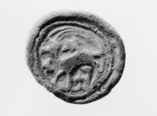 Sárgás rózsaszín agyagból kézzel formált kis pecsétlő, hátoldalán szalagfüllel. Előoldala kecskealakot mintáz levélmotívumokkal. Az egyiptomi keresztények az oltáriszentség kenyerét a kereszt jelével, állatalakokkal vagy mértani motívumokkal díszített, agyagból, kőből vagy fából készült kenyér-pecsételőkkel pecsételték le.