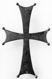 Bronzkereszt, négy, kifelé szélesedő szárának csúcsain egy-egy gömbbel. Elöl hosszú ruhát viselő, imádkozó férfialak látható szemköztnézetben, aureolával. Fölötte, alatta és két oldalt bekarcolt csillagminta. Az alak fölött bekarcolt felirat olvasható: Hagios / Nékétias.