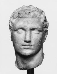 Sima állú, heves mozdulattal balra vetett ifjúfej. Erős áll, duzzadt ajak. Fürtös haj, benne széles diadéma.