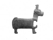 bronz kulcs egyik fele, amelyet stilizált négylábú, talán szarvas alakjában formáztak meg. Az állat testét bevésett geometrikus minták díszítik.