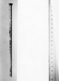 Halványzöld színű, irizáló üvegből készült tű. Egyik vége törött, másik végén ellaposodó korong alakú. Teste csavart. Tömör. Talán illatszert cseppentettek vele. |