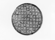 A biztosítószerkezetéhez korongos lap kapcsolódik, rajta vörös-fehér emaildíszítés látható.