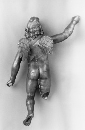 Amor-Bacchus lebegő alakja csak a bal lábfejével érinti a földet. Arccal előre, kissé felfelé néz. Arca pufók, részletgazdagon kidolgozott. Hajfürtjei nagy tincsekben omlanak a nyakára és vállára, homloka felett kis gyermekcopfot visel. Jobb kezét felemeli, ujjaiban valamilyen tárgyat, talán szőlőfürtöt tarthatott. Bal kezét a test mellett leengedi, ujjainak helyzetéből arra következtethetünk, hogy ebben a kezében is tarthatott valamit. Szárnyain a tollak belső részleteit finom vésettel alakították ki. Testének gyermeki teltségét jelzi pocakja és a combok hátoldalán látható bőrredők is. A vállán átvetett szarvasbőrtől (nebris) eltekintve meztelen. A jobb vállon látszik az állat feje és patás lábai. Öntött bronz, a szemeket és a fogakat ezüstberakással alakították ki. A szájon és elöl a nebris felső részén rézborítás látható. |