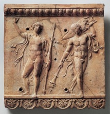 Szürkésvörös agyagból, formából készítették. A relief felső részét kiemelkedő párkány és alatta tojás-sor, alsó részét léctag és alatta indadísszel összekötött palmettasor keretezi. A bal oldali alak Bacchust jeleníti meg a klasszikus görög művészetből kölcsönzött kompozícióban. Jobb kezét felemeli, baljában thyrsost tart. A vállára borított, a szélben enyhén lobogó köpenytől eltekintve meztelen. Lábán sarut visel. Előtte fiatal satyros archaizáló tánclépésben, klasszikus kori elemekkel ábrázolt testtel, vállán párducbőr. Jobb kezében a föld felé fordított fáklya, bal kezével egyensúlyozza a vállán tartott megkoszorúzott borosamphorát. A két alak szinte kilép a lap síkjából előrelépő lábával. A lapon látható négy nagyobb és egy kisebb lyuk a felerősítést szolgálta.