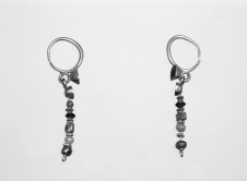 Mindkét vége felé elvékonyodó, összehajtott karika aljára négyszögletes keretet forrasztottak, benne zöld kő. A foglalat takarásában kis hurok helyezkedik el, ehhez kapcsolódik a fülbevaló csüngő része, amelyet alul egy kis hurok zár le. A csüngőn felváltva helyezkednek el aranygyöngyszemek és színes kövekből faragott gyöngyök.