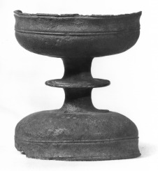 Két ellentett, szimmetrikusan elhelyezett csészéből áll. A szár kis reliefgyűrűvel kapcsolódik a testhez. A csésze ívesen kihajló. A perem alatt az edénytesten vékony borda látható. |