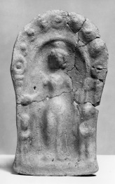Világos téglaszínű agyagból, erősen kopott formában készült. Hátoldalán függesztőfül található. A félköríves záródású fülkében Tanit istennő látható, akit ruhátlan Venus alakjában ábrázoltak. Kitárt karokkal áll kísérő állatai, a szfinxek között. Jobbjában paterát (?), baljában meghatározhatatlan hosszúkás tárgyat tart. A fülkét oszlopok keretelik, felül az égboltot jelképező korongok zárják le, így adva hátteret Tanitnak, akit az égi melléknévvel is tiszteltek (Tanit Caelestis).