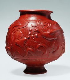 Agyaga sárgásvörös. Felületét barnásvörös bevonat borítja. Hosszúkás, konkáv, csonkakúpra emlékeztető talpgyűrűjén gömbölyded test ül. Nyakrésze alacsony, ívelten kihajló, hozzá alacsony, kifelé duzzadó perem csatlakozik. A perem az égetés során deformálódott. A hason vízszintes vonalak között cseppentett (à la barbotine) technikával felvitt díszítés: borostyánindák között bogyót csipegető páva látható.