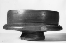 Alacsony talapzaton ülő kutyát formáz. Előre néz, fülei hegyesek, felállóak, a feje körül bundája dúsabb. Nyakában szalag, azon kis csengettyű függ. A kiöntőrész a fej tetején helyezkedik el. A fejtetőhöz, a hát közepéből kiinduló szalagfül csatlakozik. Formából készült. Agyaga világos téglaszínű. Felületét fehér alapra helyezett vörösesbarna és fekete bevonat borítja. |