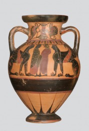 A nyakamphora alacsony, csonkakúp alakú, fekete mázzal borított talpon áll; teste tojásdad, narancsvörös alapszínén feketealakos díszítéssel; függőleges állású, hengeres füleit nagyrészt fekete máz borítja, akárcsak a száj erősen kiugró peremét. A váza nyakán mindkét oldalon kereszt alakban összefonódó palmettákból és lótuszvirágokból álló növényi díszítőmotívum látható, alattuk kiugró gyűrű fut körbe, a váll kezdetét hangsúlyozva. A vázatest egyetlen alakokkal díszített sávját felül váltakozva fekete és sötétvörös elemekből álló nyelvmintasor, alul két vörös csíkkal szegélyezett, vastag, fekete sáv keretezi. A váza alját elvékonyodó sugarakból álló koszorú díszíti. A képsáv alakjai, a váza egyik oldalán: két szembeforduló szfinx között beszélgető (?) nő és szakállas férfi; a másik oldalon: két szembeforduló párduc között vízimadár. Az alakok belső részleteit bekarcolással és a fekete mázra festett, ún. járulékos vörös színnel ábrázolta a festő. A hasonló módon díszített, tojásdad nyakamphorák főként a Kr.e. 6. század második negyedében készültek nagy mennyiségben athéni műhelyben, csoportjukat "tyrrhén amphorák"-nak nevezik (attribúció). A "tyrrhén" elnevezés (az etruszkok görög neve) onnan származik, hogy a csoport legtöbb példánya Etruriában került elő. |