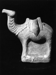 Alacsony, négyszögletes posztamensre helyezett álló teve alakját formázza. Púpjai között szíjakkal a hátára erősített nyereg látható, amelyről két oldalt egy-egy amphora lóg. Az orrán egy, a hátán három lyuk található. Vörösesbarna agyagból formában készült. A felületén fehér festés nyomai láthatók.