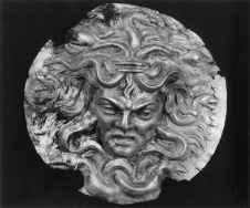 A vékony ezüstlemezből domborított kör alakú lap nagy részét betölti a férfias vonásokkal megmintázott Gorgófő. Hajában pántot visel. A korong szélén egy keskeny perem fut körbe. Arca patétikus. Homloka közepébe hullámos hajtincsek hullnak, mellettük barázdák láthatók. Szemöldöke markáns, szemei plasztikusak, a pupillákat egy-egy poncolt pont jelzi. Orra rövid, húsos. Száját kissé kinyitja. Álla markáns. Körülötte hosszú hullámos, szerteszét álló, szinte lebegő hajfürtök között tekergőző kígyók láthatók. A kígyók az álla alatt csomókba tekerednek és kétoldalt visszakanyarodva arcába harapnak.