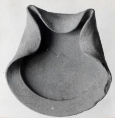 Nyitott, lapított, kerek csésze. A fala az alján megvastagodik. Széles pereme belül lépcsősen válik el a csésze belsejétől. A három helyen behajlított perem becsípésével két, csőrszerű kanócnyílást képeztek. Az alj lapított. Mázatlan, korongolt. A Néprajzi Múzeum (Országos Történeti Múzeum) átadása (1950). Azelőtt a Néprajzi Tárban őrizték, de mégsem Hopp Ferenc 1897-es vásárlása nyomány került oda.
