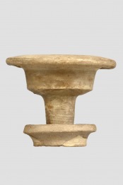 Hengeres, magas talpon álló szélesperemű csésze. A talp egy másik, kisméretű, kihajló peremű csészében áll, amelynek közepén alul kúp alakú bemélyedés van. Az aljon látszanak a korongról való levágás nyomai. Mázatlan. Hopp Ferenc ajándéka a MNM-nak (1897), ahol a Néprajzi Tárba került. A Néprajzi Múzeum (Országos Történeti Múzeum) átadása (1950).