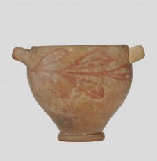 Talpgyűrűn álló, lefelé keskenyedő skyphos. Kétoldalt vízszintes szalagfül. A fülek zónájában, az egyik oldalon vörös konturvonallal körberajzolt fekvő babérág. Ld. az 50.1069 sz. darabot. Hopp Ferenc ajándéka a MNM-nak (1897), ahol a Néprajzi Tárba került. A Néprajzi Múzeum (Országos Történeti Múzeum) átadása (1948).
