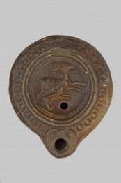 Kerek mécses. A tányértól körbefutó barázdákkal elválasztott vállat kyma-sor díszíti. A tányéron reliefdísz: rohanó szarvasra támadó kutya. Hopp Ferenc ajándéka a MNM-nak (1897), ahol a Néprajzi Tárba került. A Néprajzi Múzeum (Országos Történeti Múzeum) átadása (1948). |