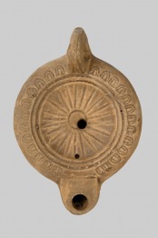 Korong alakú mécses függőleges, bordázott, átfúrt fülell. A tányért kyma-minta szegélyezi, ezen belül két körbefutó barázda. A tányér közepén kör, körülötte sugarak. Az orr közelében kanócigazító lyuk. A talpon két koncentrikus kör. Hopp Ferenc ajándéka a MNM-nak (1897), ahol a Néprajzi Tárba került. A Néprajzi Múzeum (Országos Történeti Múzeum) átadása (1948).