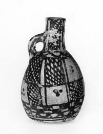 A kézzel készült, lapos aljú, lapított ovoid testű, rövid hengeres nyakú edény válla és a nyak középső része között kisméretű, függőleges fül látható. Az edény teljes felületét sötétvöröses-barna színű festett díszítés borítja. A nyak két oldalát rácsmintával díszített mező, elülső részét pedig függőlegesen elhelyezett hármas cikk-cakk sáv díszíti. A nyak és a test díszítését, találkozási pontjuknál egy-egy vízszintes vonallal keretezett félkörsor választja el. A testen sakktáblaszerűen két sorba rendezett díszítés látható, amelyben egy rácsmintával kitöltött-, és egy középen három ponttal díszített mező váltakozik egymással. A test alsó harmadát keskeny, vízszintes ornamentális sávok: sakktáblaminta, félkörsor, függőleges vonalkötegekből álló minta díszíti. Az edény alja sem maradt díszítetlenül: egy festéssel teljesen kitöltött körből egymást keresztező, párhuzamos sávok indulnak ki. Az edény díszítése alapján az úgynevezett ’fehér festett áru’ típusába sorolható és a ciprusi középső bronzkor II. – III. fázisába tartozik. |