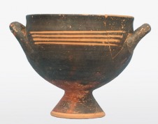 Lefelé kiszélesedő csonkakúp alakú talpon álló kétfülű ivóedény, azaz skyphos. A két fül között elhelyezkedő díszítés befestetlenül hagyott, kihagyásos vízszintes sávokból áll. Az edényforma a mykénéi kor kései szakaszától kezdődően a legnépszerűbb ivóedényformák közé tartozott, népszerűségét a kora-vaskorban is megőrizte. Ez a darab az attikai skyphosok egyszerűbb kivitelű példányai közé tartozik. |