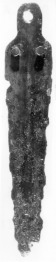 A barna patinával borított vörösrézötvözetből készült tőr markolata és pengéje jól elkülönül egymástól. A markolat eredetileg három szegecse közül a felső, amely a lekerekített markolatnyelv közepén helyezkedett el, hiányzik. A lapos, romboid keresztmetszetű penge legszélesebb pontja a két alsó szegecs vonalában található, majd innen fokozatosan keskenyedve fut le a tompa hegyig . A penge közepén a válltól a hegyik borda fut végig. Az állítólag Haghia Paraskevi egyik sírjából származó tőr a rézben gazdag sziget későbronzkori időszakának jellegzetes fegyvertípusa. |