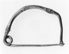 Az aranyból készült fibula az ívfibulák típusába sorolható, amely nevét félköríves kengyeléről kapta. Az itt látható darab íve a tűtartó felett megtörik és egyenes vonalaban csatlakozik hozzá. A fibula romboid keresztmetszetű megtörő ívét a töréspont után és a rugó fölött rovátkolással kitöltött, hordóalakú gyöngy formájú reliefgyűrűk díszítik. Az ívfibulák a lapított kengyelű, úgynevezett hegedűvonó-fibulákból eredeztethetők, amelyek még a bronzkor végén jelentek meg északi hatásra a Kelet-Mediterráneum és így Ciprus térségében. A ismeretlen eredetű budapesti darabhoz hasonló fibulák Ciprusról ismertek, és már a vaskor elejére keltezhetők. Ezek alapján a budapesti fibula is minden bizonnyal Cipruson készült, a ciprusi vaskor, a cipro-geometrikus időszak I. fázisában, valamikor a Kr.e. 11.század második felében. |
