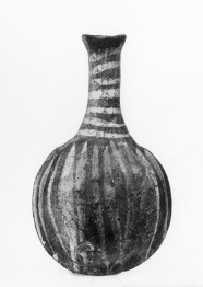A talpnélküli, egyfülű lapos, palack formájú edény két formából összerakott teste törés nélkül folytatódik az enyhén kihajló peremben végződő nyakban. A szalagfül a váll és a nyak közepe között ível. Az edény nyakát és testét fehér színű festés díszíti. A nyakon párhuzamos, vízszintes sávok futnak körbe, a testet pedig függőleges sávozás borítja. Az edény tipológiailag a Base-Ring áru II típusába sorolható, de maga a forma már a I típustól megtalálható. A lapos palack forma a Ciprus későbronzkorának egyik legelterjedtebb kerámiatípusa, amelyet Cipruson kívül is több helyen helyben utánoztak.
