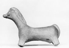 A kézzel formált, üreges négylábú állat lovat mintáz. A test részleteit, a szemet, a sörényt és a farkat a testhez tapasztott agyagdarabopkból alakították ki. A sörényt rézsútos bekarcolt vonalakkal tették még életszerűbbé. Ugyanígy bekarcolással jelölték a szájat is. Az orr vízszintesen fúrt lyukként jelenik meg. A figurán több helyen figyelhetők meg készítéséhez kapcsolódó vonások: a test felületét bőrkemény állapotban, még az égetés elött simítópálcával simították el, a felület azonban nem lett tökéletesen egyenletes, amit a simítópálca szélei által hagyott, a testen két oldalt látható vízszintes vonalak is mutatnak. A hason látható négy bevágás az égetésnél szükséges szellőzőnyílásként szolgált. Az állatalakú kisplasztika Ciprus későbronzkori művészetének jellegzetes műfaja volt, a megmintázott állatok között legnépszerűbb a bika, a ló és a madár figura volt. |